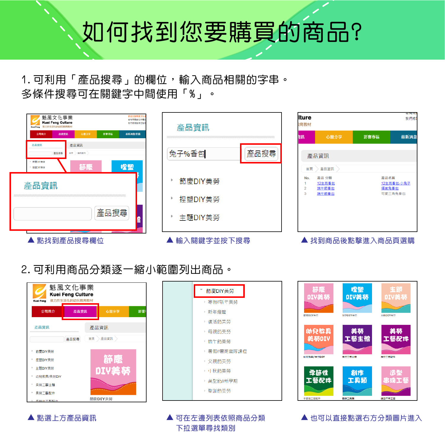 1.可利用「產品搜尋」的欄位, 輸入商品相關的字串,多條件搜尋可在關鍵字中間使用「%」。